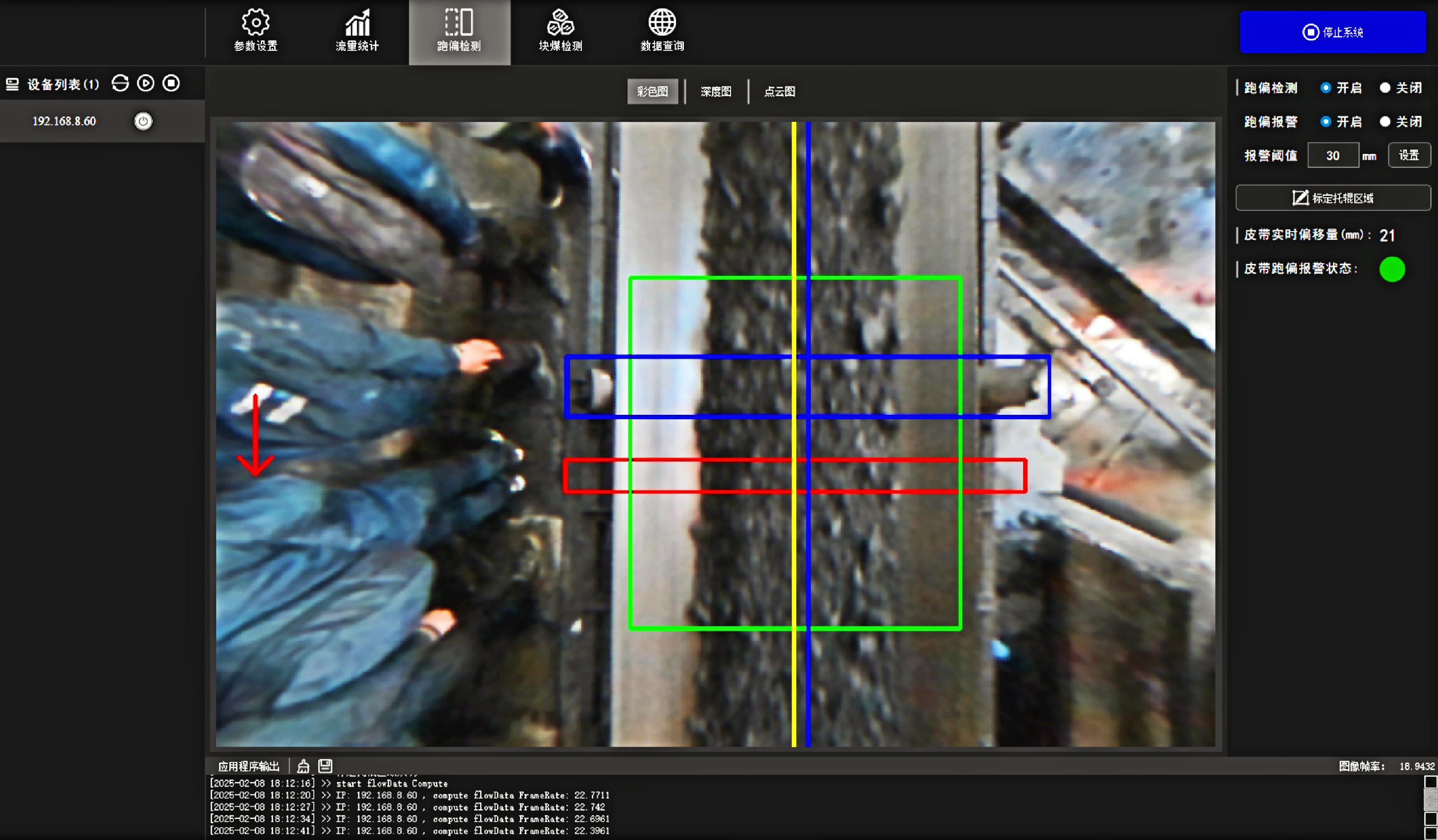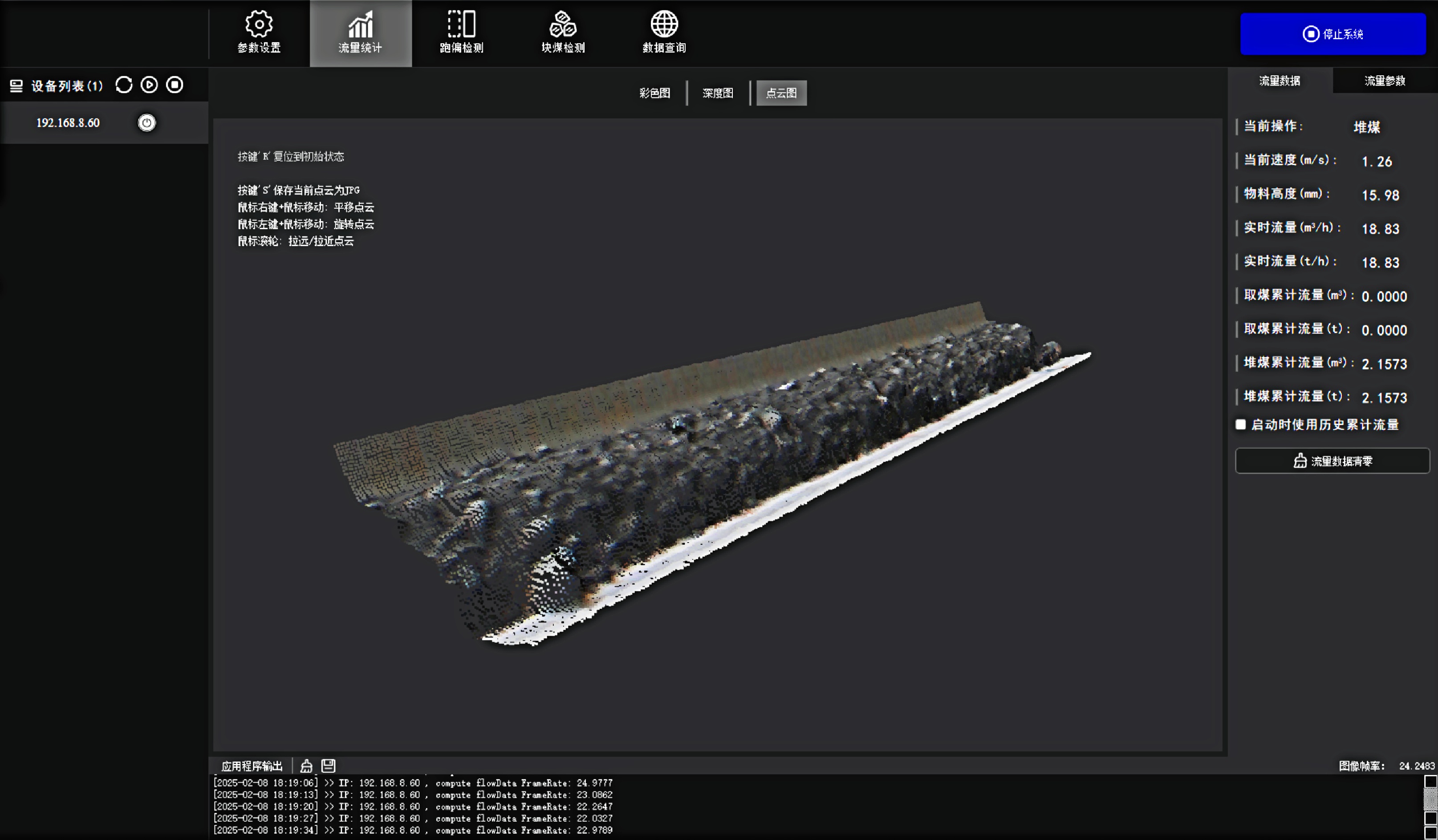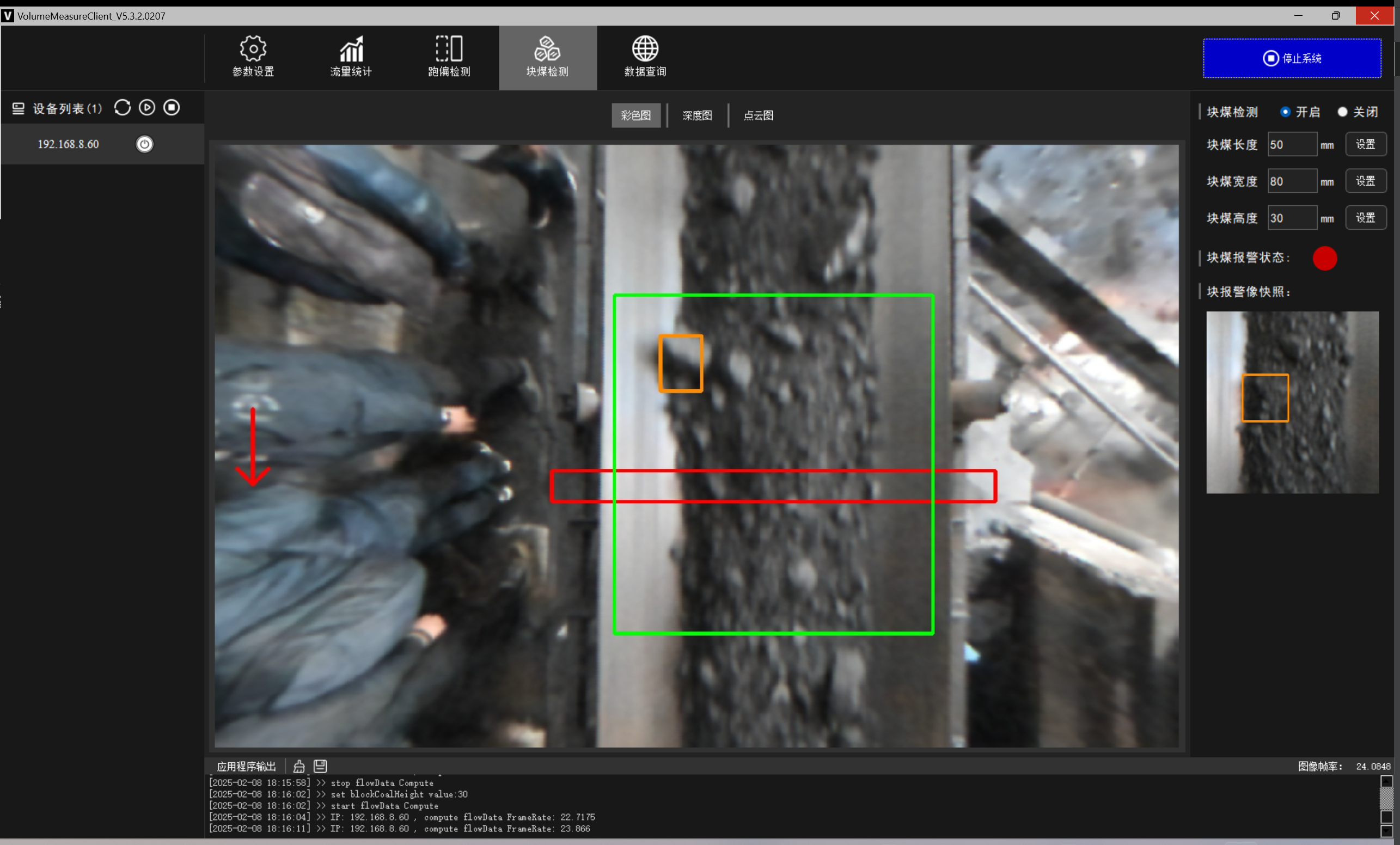 料型料流监测一体机系统 MILE|米乐·M6®智能料型料流监测系统由智能煤流监测一体机搭配监测平台构成,实时监测输送带工业散料流量,包含煤矿、砂石骨料、粮食等 首页 产品 3D相机 MILE|米乐·M6® 料型料流监测一体机 RBGD智能一体机 MILE|米乐·M6® 料型料流监测一体机 系统由智能料流监测一体机搭载监测平台构成,由稳定的底层硬件、嵌入式算法软件和自动化监测管理平台实现服务,实时采集高精度煤流RGBD数据,完成场景的实时三维彩色点云重建,对高速运动的皮带输送机进行精细化管理调控→应用场景: 煤矿检测系统精细化管理 定制解决方案 应用场景 煤流统计支持皮带速度6m/s,环境适应强,部署简单,无需改造现场环境即可安装块煤检测通过三维点云数据分析,能够对块煤的尺寸进行精确测量,准确计算出块煤的长、宽、高等尺寸数据输送带自动测速自动测量高速运动中的输送带速度,确保及时发现异常波动输送带跑偏检测通过获取的输送带三维尺寸位移信息,对皮带左右边缘位置与阈值比较并判断是否偏离正常轨道,同时计算跑偏幅度和方向煤流高度检测对煤流高度精准检测,能够有效管理煤流的分布、运输量、堆积情况 产品特点 测量误差<5%在高速动态检测上,测量精度可达毫米级,测量结果与实际煤量误差小于5%工业级硬件设计采用IP65防护等级和工业级防尘防水,可在高粉尘、大温差的情况下稳定运行室内暗光环境适用在室内、地下、夜晚能稳定测量,无需补光部署简单,安装便捷,支持二次开发出厂相机内参标定,可快速部署集成,无需改变现场环境即可安装,实施速度快,调试简单,系统易于维护接口丰富,数据直传丰富的系统对接接口,可直接对接PLC、变频器、服务器,快速完成精细化皮带控制大景深、大视野,多范围应用测量皮带宽度达2.4m;煤堆高度达1.5m边缘计算架构,实时测量使用边缘计算架构,将多种智能算法在边缘端实现,保证数据实时传输 性能参数 RGBD智能一体机型号VEA020-800-X180参数技术原理主动式双目基线长度180mm测量范围0.9m~2.5mZ向精度1m:≤1.3mm帧率25fps数据类型深度图、彩色图、红外图、点云图分辨率彩色图像:1280x800/640x400 ; 深度图像:1280x800/640x400像素形式彩色图: 8位三通道图 ;深度图:16位单通道图彩色视场角Horizontal 90°,Vertical 64°深色视场角Horizontal 90°,Vertical 64°RGBD同步对齐支持曝光类型全局曝光曝光控制自动/手动流量统计技术参数推荐安装高度1.2m~1.5m覆盖输送带范围0~3m支持输送带速度0~6m/s,推荐0~4m/s流量统计精度误差<5%物料高度测量支持,精度毫米级自动测速支持,安装位置需要具备照明条件实时流量统计 支持,统计周期支持配置跑偏检测支持,跑偏精度可达毫米级块煤检测 支持,支持块煤参数定义数据存储支持5年以上体积结果化数据存储数据查询支持按小时,天和月等维度查询实时视频支持rtsp协议彩色图像拉流点云数据支持彩色点云拼接数据输出协议支持TCP硬件参数数据传输接口千兆以太网相机供电要求12V~24V DC功耗18w结构尺寸(mm)270mm x 80mm x 44mm重量(g)1200g防护等级IP65温度工作温度:-25 ~50°C ;存储温度:-30 ~80°C湿度20% ~ 85%散热方式被动散热软件支持开发环境Windows/Linux数据协议TCP数据查看流量统计客户端 点云图 资料下载 MILE|米乐·M6® 煤流体积测量输送带监测管理平台 产品资料下载 请填写此表格并点击提交后,程序会自动下载文件 *合作意向 请选择 商务合作 媒体合作 投资者合作 *电话 *姓名 公司 行业 职位 邮箱 地址 您的留言 提交并下载资料 您也可以拨打MILE|米乐·M6的客服电话:010-81046658 联系MILE|米乐·M6